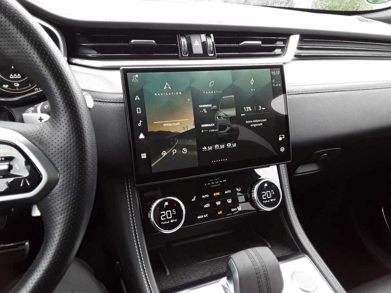 Sonderausstattung:SERIENAUSSTATTUNG 8-Gang-Automatikgetriebe Adaptive Dynamics (Adaptives Fahrwerk) All Surface Progress Control Acoustic Vehicle Alerting - System (AVAS) Berganfahrhilfe Differenzial mit Torque Vectoring by Braking (TVBB) Dynamic-Modus, konfigurierbarer Dynamische Stabilitätsskontrolle (Dynamic Stability Control, DSC) Elektromechanische Servolenkung, geschwindigkeitsabhängig Stopp/Start-System JAGUAR Schriftzug und Leaper R-Dynamic Front- und Heckschürze R-Dynamic Kühlergrill Heckscheibe, beheizbar Regensensor Begrüßungslicht LED-Heckleuchten LED-Scheinwerfer mit LED-Signatur Nebelschlussleuchten Sensorgesteuertes Fahrlicht F-PACE und R-Dynamic Emblem P400e AWD Emblem Sportsitze in DuoLeder in Ebony mit Interieur in Ebony/Ebony Dachhimmel in Morzine (Stoff) - Ebony Multifunktions-Lederlenkrad mit R-Dynamic-Emblem 2 Getränkehalter vorne 3 Kopfstützen im Fond Ablagefächer in den Türen, vorne und hinten Ablagefächer, seitlich in Mittelkonsole Außentemperaturanzeige Einstiegsleisten hinten aus Edelstahl Einstiegsleisten vorne aus Edelstahl mit R-Dynamic-Emblem Innenrückspiegel, automatisch abblendend Ladekanten-Schutzleiste aus Edelstahl Leseleuchten vorne Mittelkonsole mit Armlehne Schaltwippen in mattiertem Chrom Sonnenblende mit beleuchteten Schminkspiegeln 2-Zonen-Klimaautomatik Heckklappe, elektrisch Android Auto, kabellos Apple CarPlay, kabellos Bluetooth-fähiges Telefonsystem mit Bluetooth Audiostreaming Digitales Radio (DAB+) Dynamische Lautstärkenregelung Jaguar Soundsystem 180W, 6 Lautsprecher 11,4-Zoll-Touchscreen 12,3-Zoll-TFT-Instrumentendisplay ECO-Daten Anzeige Sprachsteuerung Adaptive Geschwindigkeitsregelung (Adaptive Cruise Control, ACC) mit Stauassistent Aufmerksamkeitsassistent Autonomer Notfall-Bremsassistent (Autonomous Emergency Braking, AEB) Inhalt von Fahrassistenz-Paket1 und 2 Einparkhilfe vorne und hinten Rückfahrkamera Spurhalteassistent Verkehrszeichenerkennung mit adaptivem Geschwindigkeitsbegrenzer Alarmanlage, perimetrisch Bremsbelagverschleißanzeige Elektrische Parkbremse (Electric Parking Brake, EPB) Front- und Seitenairbags für Fahrer und Beifahrer ISOFIX-Befestigungspunkte im Fond (äußere Sitze) Kindersicherung, elektrisch Kopfairbag vorn und hinten Türgriffe vorne mit separaten Verriegelungstasten Warnhinweis bei Nichtanlegen des Sicherheitsgurts Handschuhfach, verriegelbar Valet-Modus Zentralverriegelung mit Funkfernbedienung, Doppelverriegelung und automatischer Türverriegelung bei Anfahrt